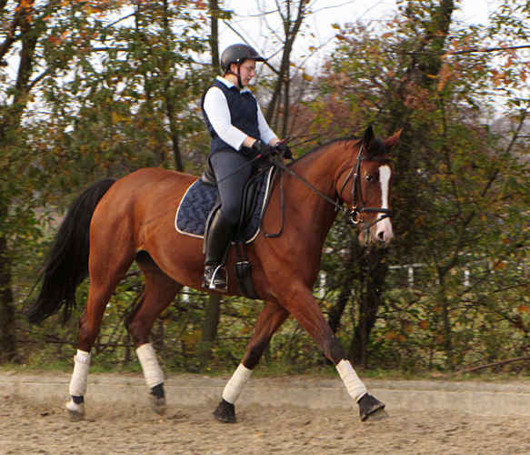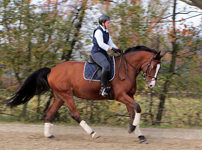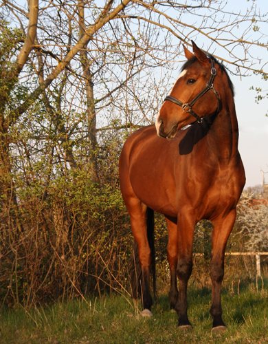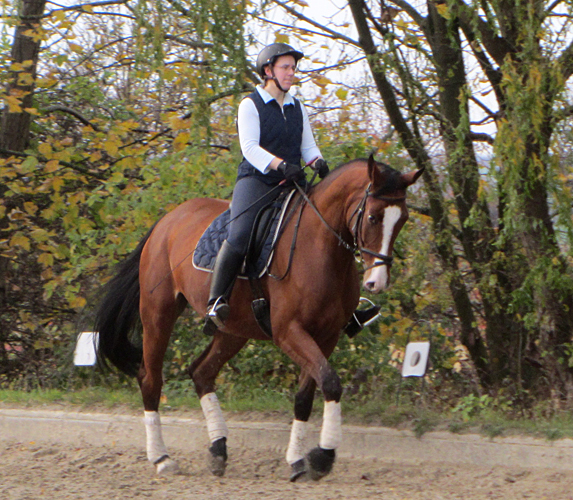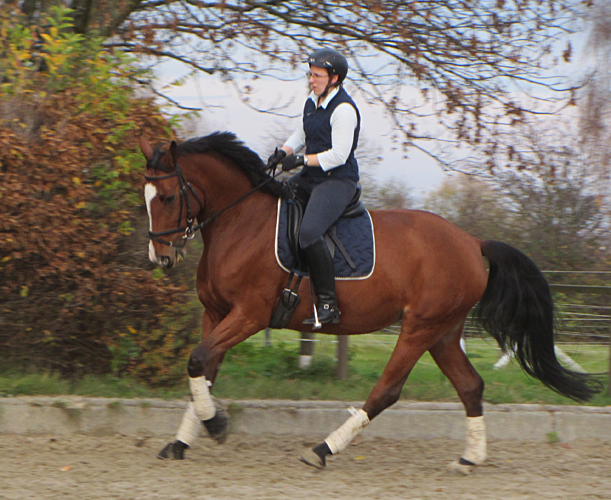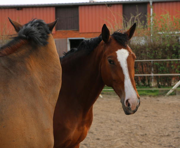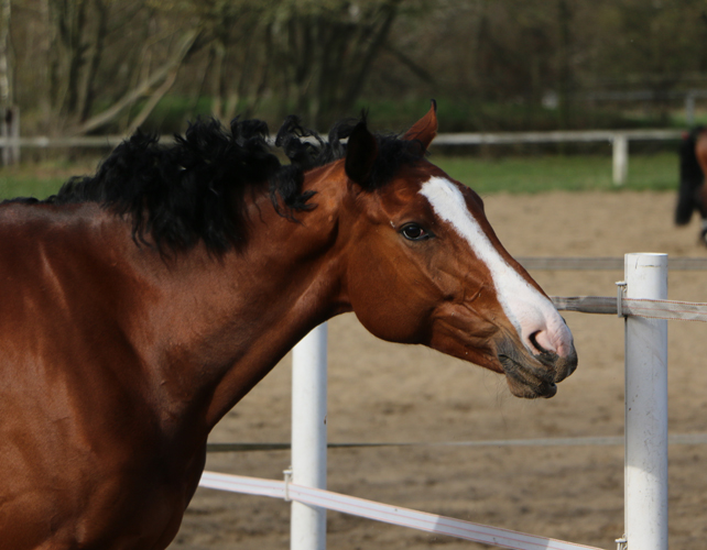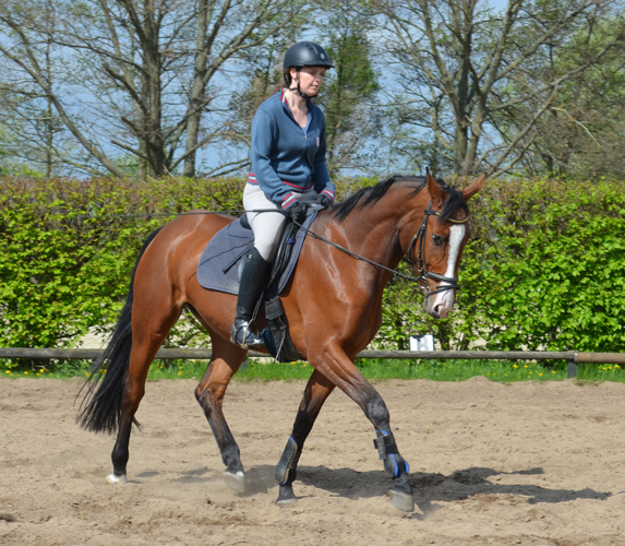 Naala hat schöne Grundgangarten und ein eher ruhiges Temperament, was sie besonders im Winter jedoch auch schonmal vergisst. Sie lässt sich sehr reell reiten, geht gut an den Zügel und gehört mittlerweile zu unseren besten Dressurpferden.
