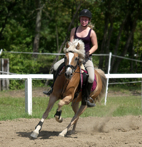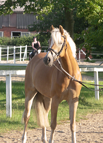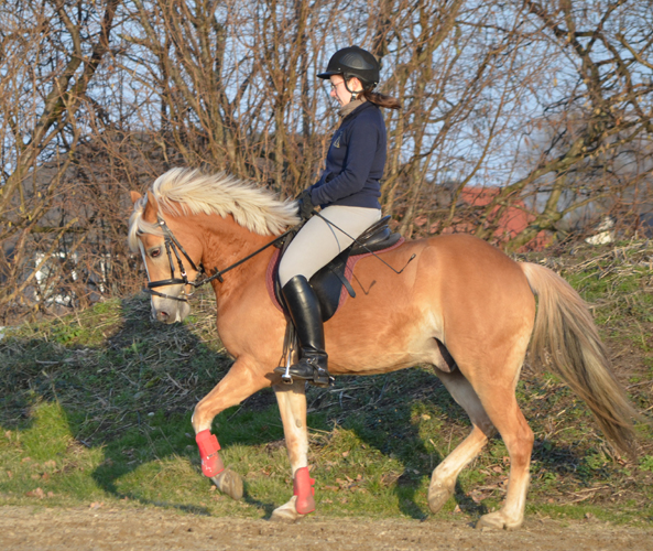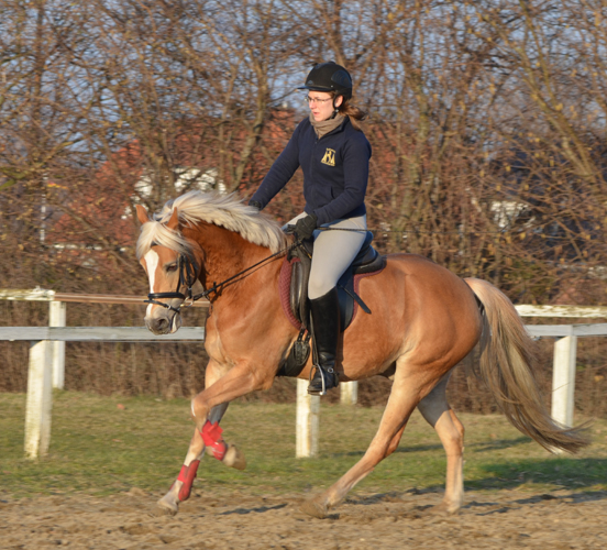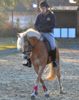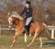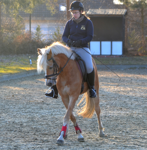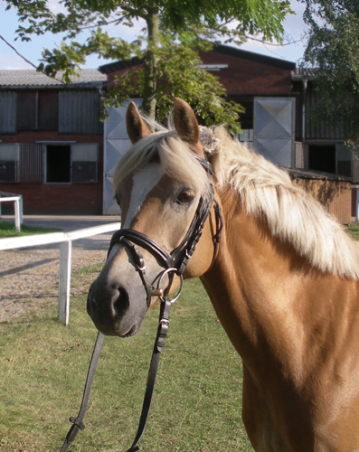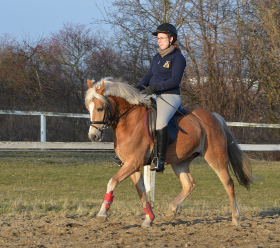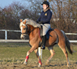Bibo hat schöne Bewegungen und bereitet Anfängern wie Fortgeschrittenen Freude. In der Dressur zeigt er mit dem richtigen Reiter, dass auch ein Schulpony nicht vor höheren Lektionen zurückschreckt.